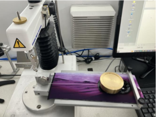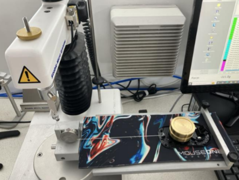 Testing was performed on a TA.XT texture analyzer fitted with a 500g load cell and a friction rig. The mousepad sample was attached to the friction rig base. The ‘sled’ was comprised of the deconstructed supplied mouse, with the weight placed on the top (see Appendix Two for images). Testing was performed with added weights of 400g and 1kg. The pad sections were cut 90° to each other for X and Y Directions.