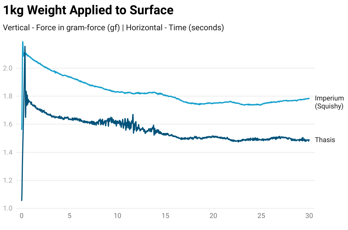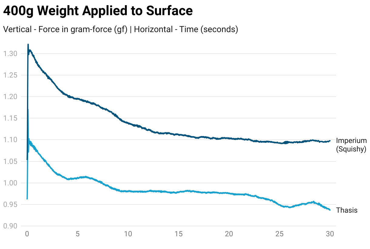 With this data, we can conclude that the Squishy PORON® base of the Imperium (Squishy) generates greater dynamic friction when extra weight is applied compared to Thasis when extra weight is applied. This is possibly due to the extra contact area the mouse and fingers (that press into the pad) have with the squishy base, leading to increased friction. We will be doing more testing to understand this better.