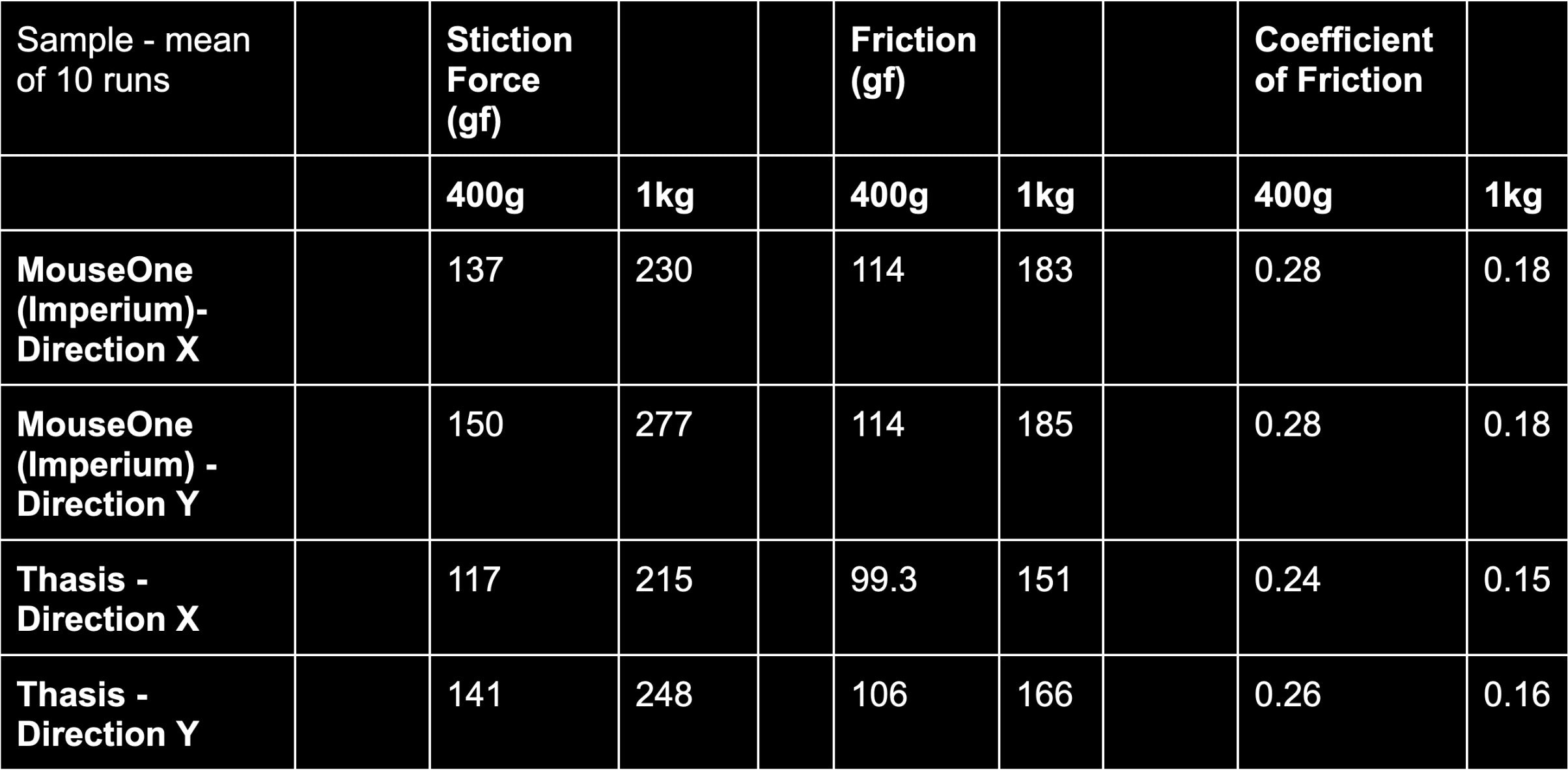 - The MouseOne (Imperium - Squishy) sample exhibits a marginally higher coefficient of friction than the Thasis sample, seen when tested at both weights and in both X and Y directions.